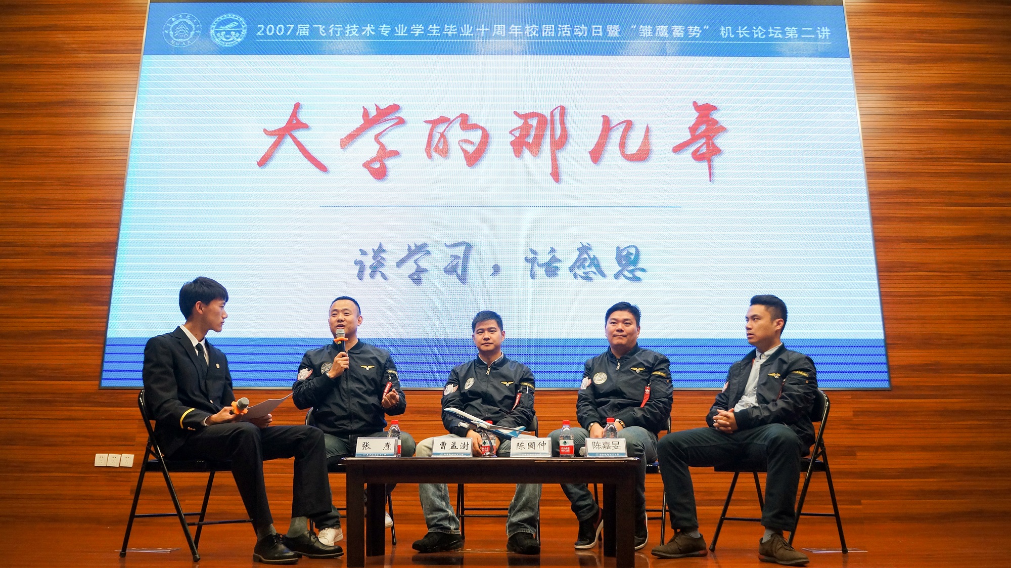 访谈环节中,张焘、曹孟澍、陈国仲、陈嘉旻四位机长与我校飞行学生访谈对话,他们分享从“大学的那几年”到“工作的那十年”,分享从青涩的飞行学员蜕变为成熟机长的心路历程。在访谈中,机长们强调在校要认真学习、遵规守纪。理论知识,英语和强健的体魄是成为飞行员的基本条件。在国外要保持谦虚好学的态度,不断学习,不停更新知识。在工作中,每一次起飞,每一次降落,谨记“飞行无小事,工作需细致”,这是对责任与担当的诠释。