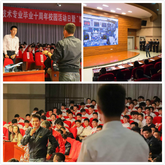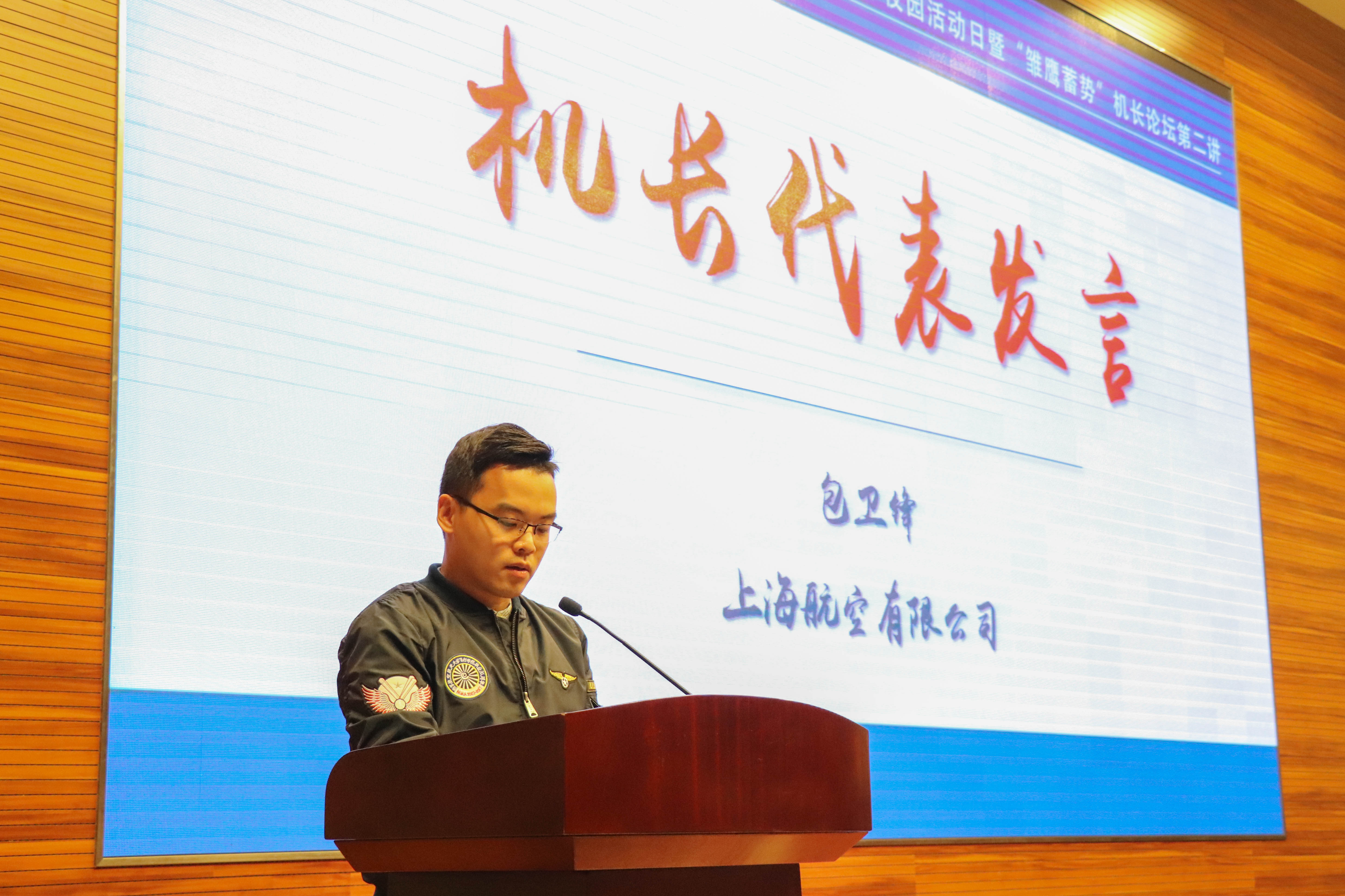 之后来自上海航空公司的包卫锋作为机长代表发言,他感谢领导给予的十年之约,感恩母校的栽培,老师的教诲。