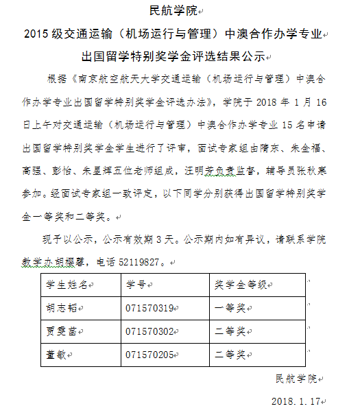 必威西汉姆联 2015级交通运输(机场运行与管理)中澳合作办学专业 出国留学特别奖学金评选结果公示