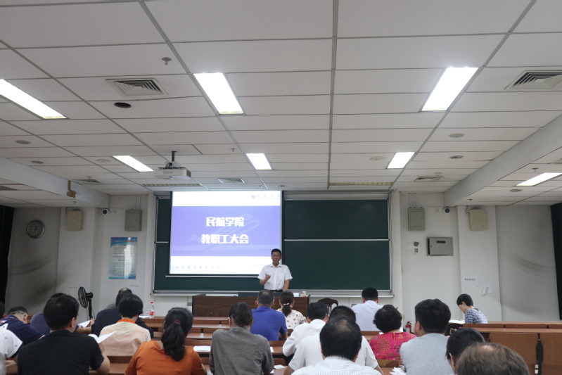 院长胡明华从师资队伍建设,学科科研建设,教学工作,飞行办学,学生教育管理,国际交流与合作以及董事会工作等七个方面对学院上半年工作进行了全面的回顾和总结,结合学校暑期干部教师会议精神对学院下半年工作进行了布置和规划,并向全体教职工详细解读了学院综合改革方案。