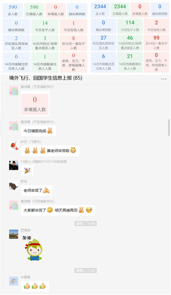 为了及时了解境外学生每日健康状况及动向,“i·南航”每日信息上报架起了跨越山海的信息桥。根据学校要求,分管院领导牵头,学管办、党政办、飞管办协调联动,组建学院境外学生打卡工作群,成立境外学生骨干信息上报群,实现老师-骨干-全体境外学生一体化网格。虽然远隔重洋、跨越时区,但是全体工作人员和境外学生协同联动,时刻保持严明的纪律意识,克服时差等困难,连日来,各类型境外学生均实现了100%打卡。