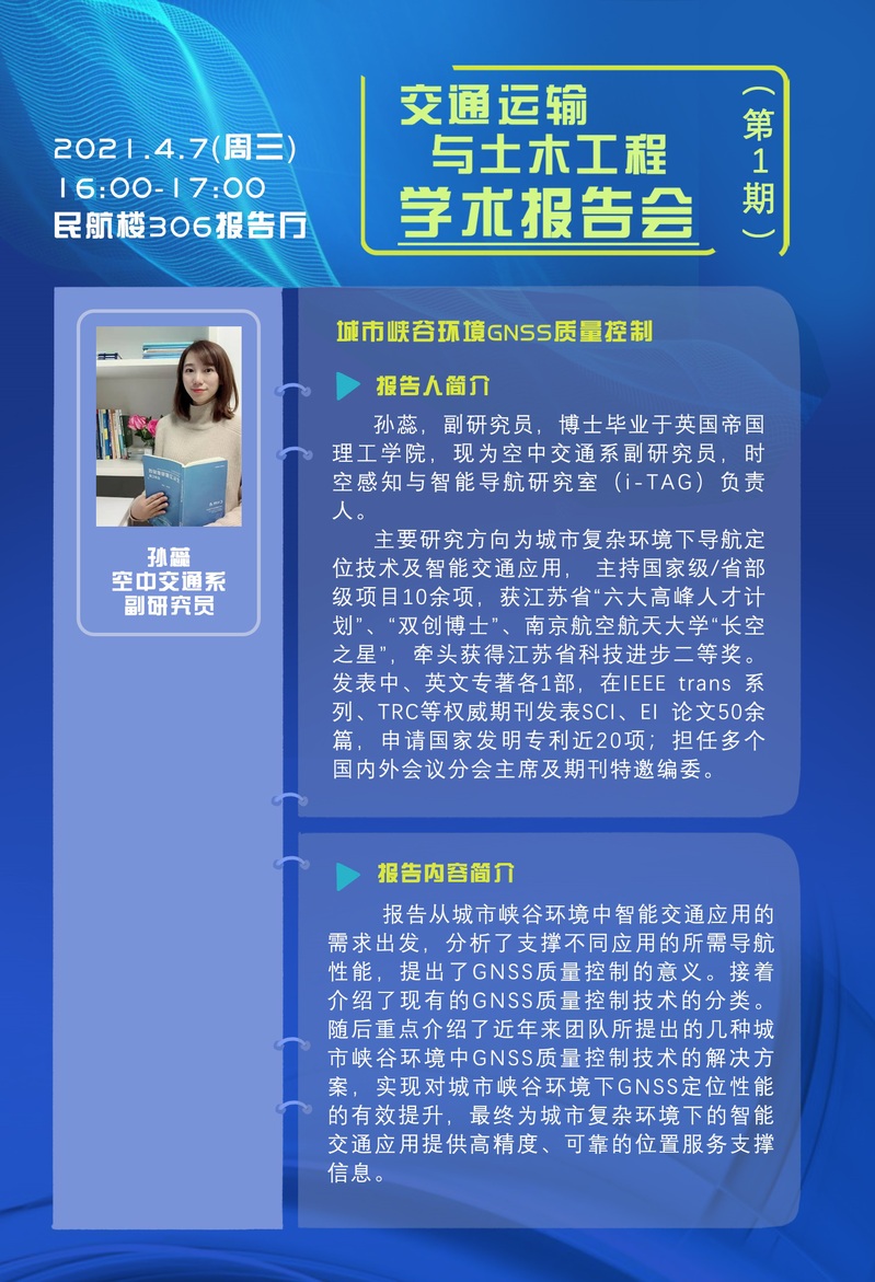 孙蕊,副研究员,博士毕业于英国帝国理工学院,现为空中交通系副研究员,时空感知与智能导航研究室(i-TAG)负责人,主要研究方向为城市复杂环境下导航定位技术及智能交通应用,主持国家级/省部级项目10余项,获江苏省“六大高峰人才计划”、“双创博士”、betway西汉姆联“长空之星”,牵头获得江苏省科技进步二等奖。发表中、英文专著各1部,在IEEE trans 系列、TRC等权威期刊发表SCI、EI 论文50余篇,申请国家发明专利近20项;担任多个国内外会议分会主席及期刊特邀编委。