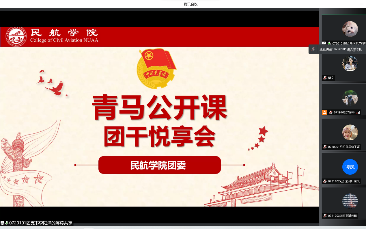 本次悦享会首先由0719101团支部书记李展鹏进行团干部工作经验分享。他从主题团日活动开展、一支部一项目建设、双述双评工作详解三个方面展开,细致讲述了团支书工作的要点与技巧,帮助团支书们更好理解团支部工作的内涵。他结合自身团支部工作的开展经验,指导团干们抓住各类活动要点。从如何选题、如何实操、如何宣传等多方面讲述了开展团学活动时所需要抓住的核心思想和注意事项,强调了为团学活动创新赋能的重要性,拓宽了团干部们的思维深度和宽度。同时,他深入讲解了新时代共青团“三力一度”的育人格局,解析了引领力、组织力、服务力的深刻内涵,教导团支书们要着力提升共青团服务大局的贡献度,鼓励团支书们为共青团工作和民航人才培养添砖加瓦。