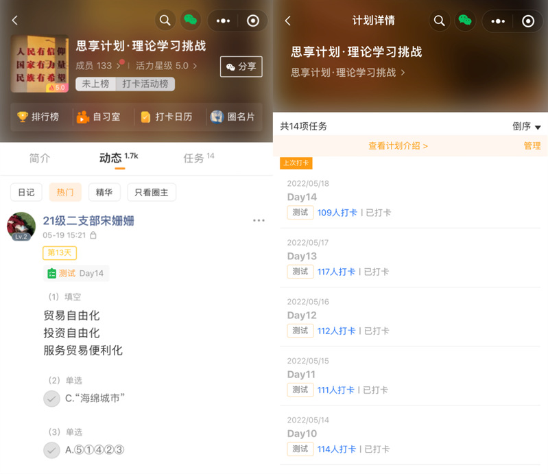 据统计,本次活动有效参与人数127人,完成14天打卡共计109人,占比86%,“小打卡”每日回答问题动态总计1700+。