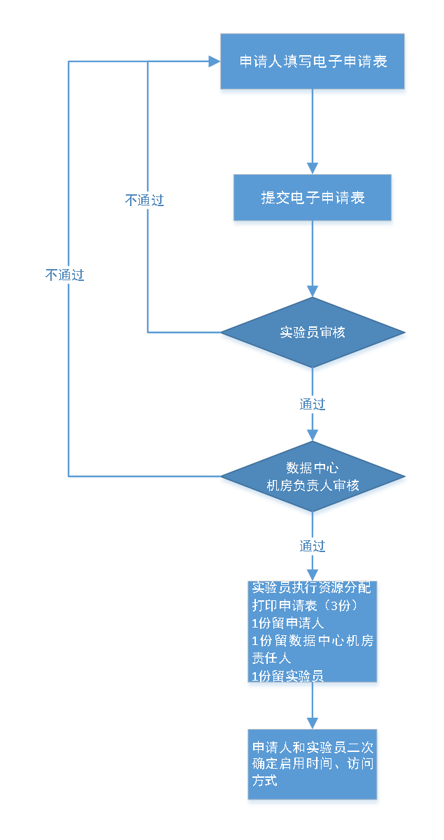 3.数据中心机房负责人同意后,实验员负责落实资源分配,打印申请表并和申请人二次确认启用时间和访问方式;