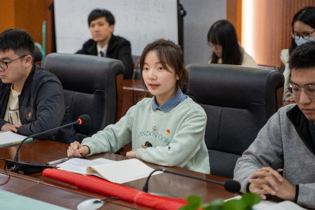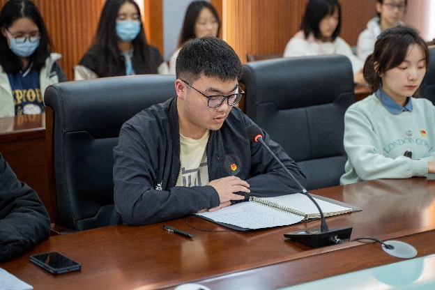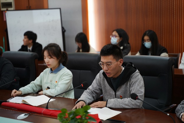 在讨论研习环节,本科生党员代表王泽源结合自己担任学院青年志愿者协会主席团成员的经历,指出广大青年要牢记习近平总书记的嘱托,坚定不移听党话、跟党走,坚持与时代同步、与国家同频,在志愿服务中发出民航学子的最强音,让青春在服务社会与人民中闪耀光芒。本科生团员代表、0720201团支部书记吕文畅介绍了支部近期开展党的二十大精神主题学习的情况和个人心得,表态要充分发挥团干部的模范带头作用,带领支部团员共同在青春的赛道上奋力奔跑。研究生党员代表陆溪结合自己在民航领域开展的科研实践,提出民航青年应当不断修学储能,在交通强国建设中彰显青年担当。研究生团员代表刘志昊重点分享了党的二十大报告中对教育、科技、人才重要性的论述,指出当代青年应树立远大的理想和抱负,踏实学习、潜心科研,做到胸怀祖国、追求真理、勇攀高峰,为建设社会主义现代化强国奉献青春、贡献力量。