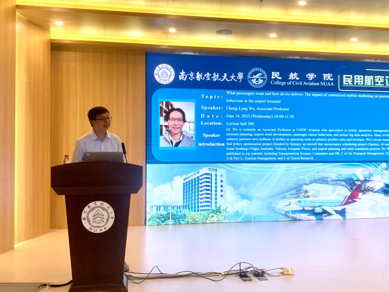6月14日上午,澳大利亚新南威尔士大学吴政隆(Wu Cheng-lung)副教授作客我院第43期“民用航空讲坛”,并作题为“What passengers want and how do we deliver: The impact of customized mobile marketing on passenger shopping behaviour in the airport terminal”的报告。必威西汉姆联副院长吴薇薇、副院长邵荃,学院师生100余人参加报告会,报告会由邵荃主持。