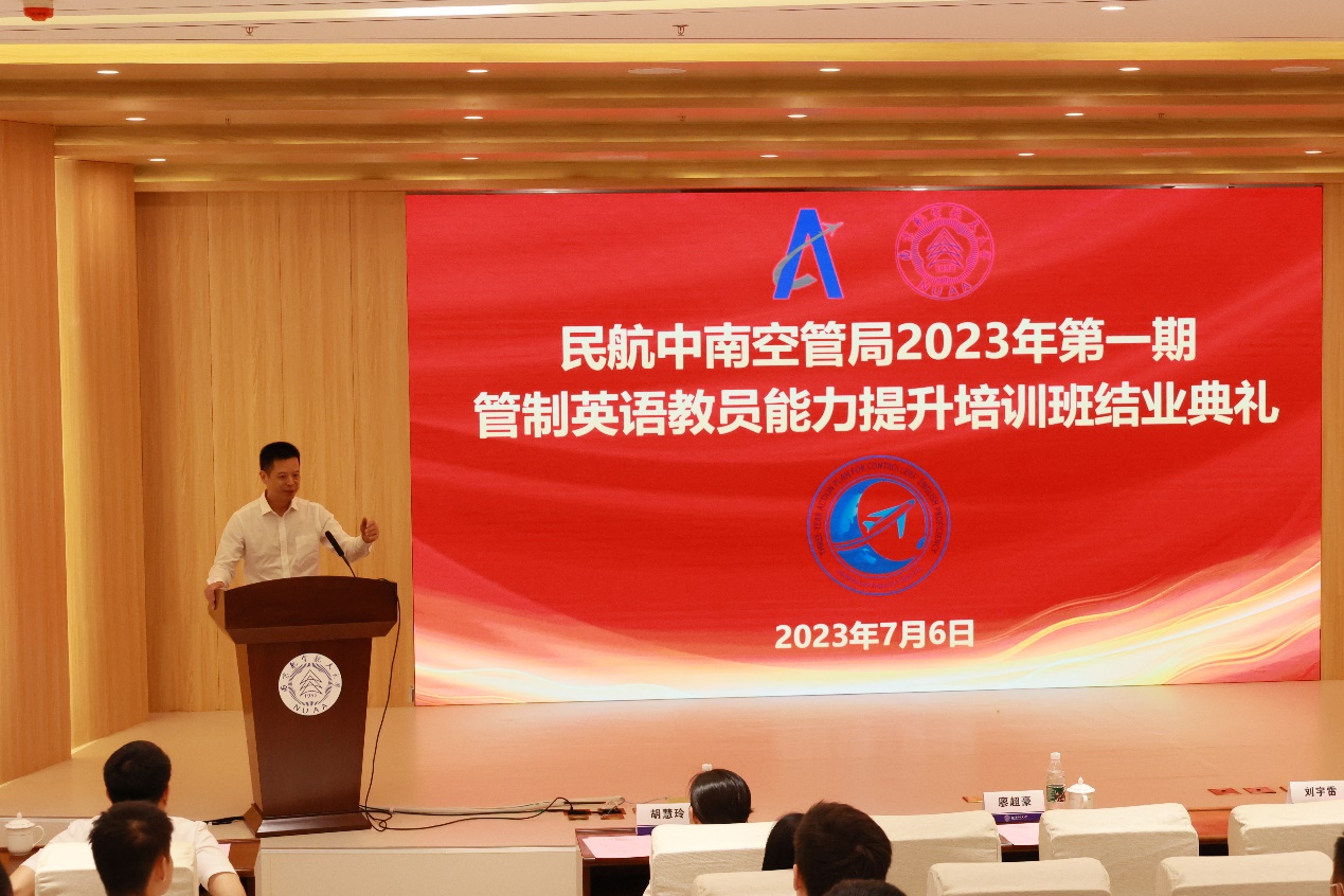 在结业典礼上,廖超豪对学校的大力支持表示衷心的感谢,并提出了三点希望:一是希望各位学员能总结归纳、学以致用,密切配合原单位的“三年行动计划”开展管制英语通话能力提高培训;二是希望各位学员持续学习,保持高水平的英语听说能力,拓展眼界、多看世界,切实提高解决问题的能力;三是希望各位学员勇于奉献、敢于担当,担起管制英语培训的责任,克服畏难情绪,用心探索、实践,切实领悟这件事对中南空管高质量发展的意义。