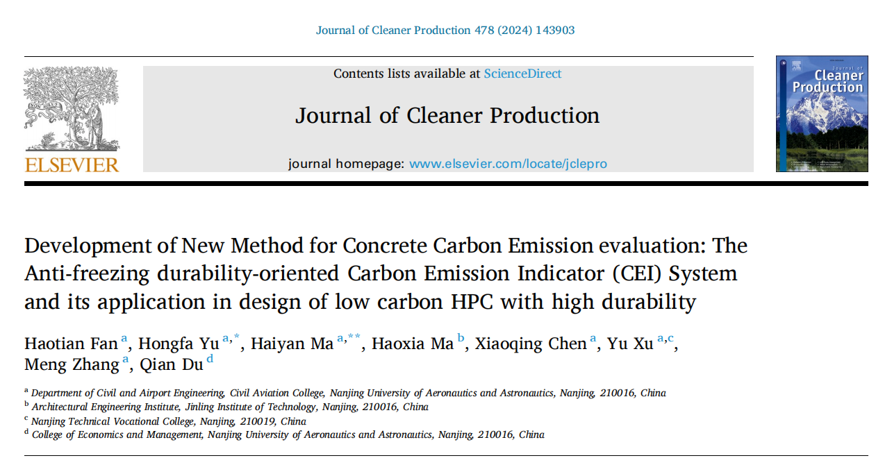 近日,必威西汉姆联土木与机场工程系“先进土木工程材料与结构”课题组在考虑耐久性的水泥混凝土材料碳排放评价体系建立研究中取得了重要进展。第一阶段成果完成了基于抗冻耐久性的混凝土碳排放研究,相关成果在线发表于国际顶级学术期刊《Journal of Cleaner Production》(影响因子9.7)上。必威西汉姆联土木与机场工程系教授余红发、副教授麻海燕为该论文通讯作者,博士生范浩田为第一作者。