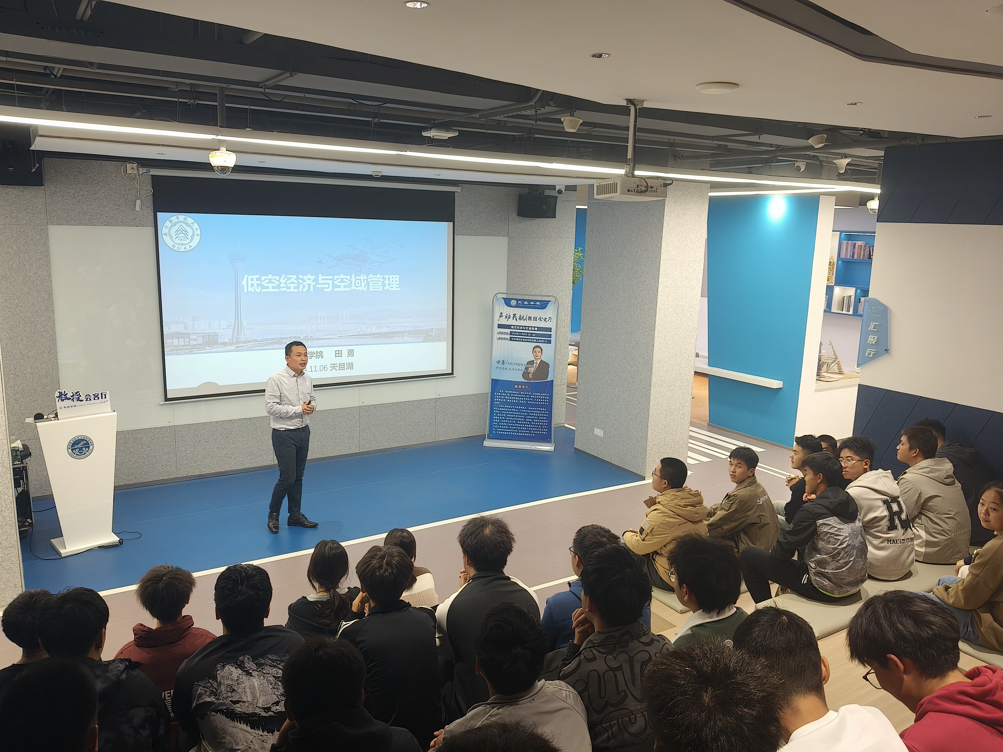 为增进低年级学生专业认知,加强低空经济复合型人才培养,11月6日,必威西汉姆联在天目湖校区一站式学生社区——智慧民航创新工坊举办“教授会客厅”活动,副院长田勇以《低空经济与空域管理》为题进行分享,学院60余名2024级空管专业本科生参加活动。