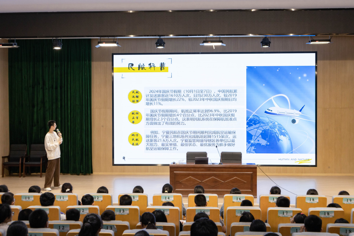 活动伊始,支部成员张子康从“初创时期的孱弱”、“稳步时期的初具规模”和“扩张时期的迅猛发展”三个阶段详细讲述中国民航从无到有、从弱到强的历史进程,他勉励南师大附中学子努力学习,练就过硬本领,将来为民航事业高质量发展贡献自己的一份力量。接着,支部成员张赫介绍了优秀民航从业者梁桂红和刘传健的先进事迹,引导学生学习他们坚守初心、追求卓越的精神,提高自我要求,用行动践行责任担当。