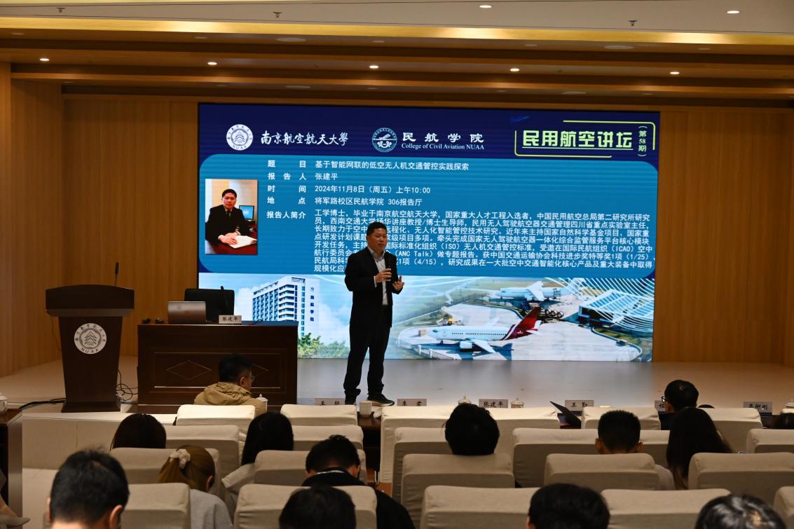 11月8日上午,必威西汉姆联成功举办第58期“民用航空讲坛”暨张建平兼职教授聘任仪式。国家重大人才工程入选者、中国民用航空总局第二研究所研究员、民用无人驾驶航空器交通管理四川省重点实验室主任、我院院友张建平受邀作题为《基于智能网联的低空无人机交通管控实践探索》主题报告。必威西汉姆联党委书记李君、通用航空与飞行学院院长王勤、南方航空公司地服部副总经理程启平,必威西汉姆联各系主任、师生代表共200余人参加报告会,报告会由必威西汉姆联党委副书记王艳主持。