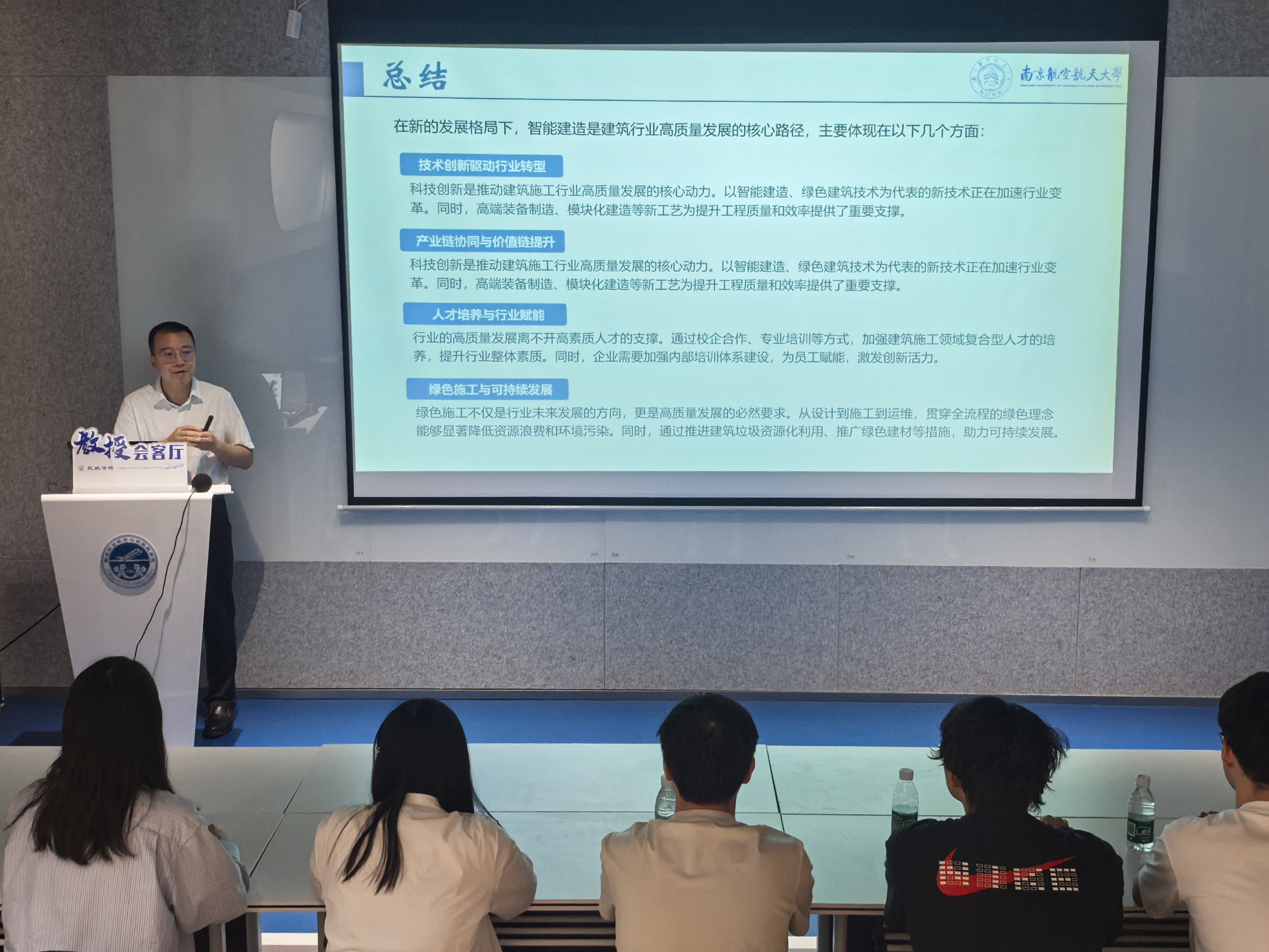 柯世堂立足发展新质生产力的内在要求,解析智能建造技术驱动下行业的发展前景,并结合智慧工地、建造机器人等实际应用案例,解读“智能+”多学科融合背景下智能建造在技术创新、产业升级中的核心作用。他强调智能建造人才需兼具工程素养与数字思维,建议学生在实践中锤炼专业能力,以创新精神破解工程难题。