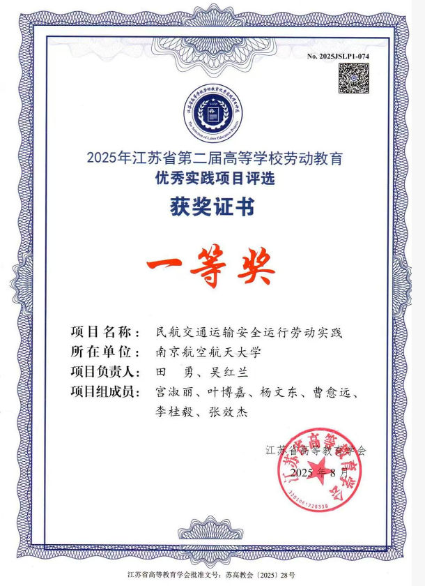 近日,江苏省第二届高等学校劳动教育优秀实践项目评选结果揭晓,必威西汉姆联“民航交通运输安全运行劳动实践”项目荣获一等奖。